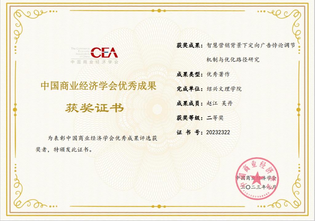2023年8月28日,绍兴文理学院买球App软件手机在线下载企业管理系赵江副教授在2022年出版的学术专著《智慧营销背景下定向广告悖论调节机制与优化路径研究》喜获中国商业经济学会优秀成果奖全国二等奖。中国商业经济学会是国家一级学会,1982年由中央书记处批准成立,是我国商业经济学术领域最高社团组织,为国家商贸流通政策制定做出了重要贡献,在商贸流通领域享有较高的学术声誉和社会影响。该学术专著《智慧营销背景下定向广告悖论调节机制与优化路径研究》是由买球官网承担的国家社科基金项目(21FGLB033)的优秀结题成果,获得五位国家社科结题鉴定专家的一致高度评价。