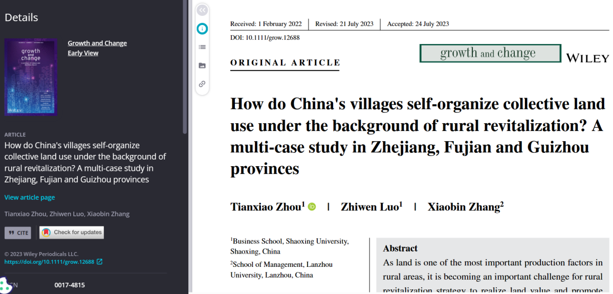 近日,买球官网周天肖、罗志文老师在Growth and Change发表论文“How do China's villages self-organize collective land use under the background of rural revitalization? A multi-case study in Zhejiang, Fujian and Guizhou provinces”。通过建立自组织、集体土地与乡村振兴的分析框架探讨村干部角色和村庄集体规则在土地自组织的运行机制,并选取中国东部两个村和西部一个村作为典型案例进行比较,论证村庄是如何根据上述机制开展集体行动的。