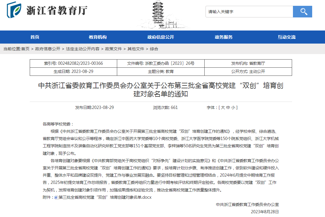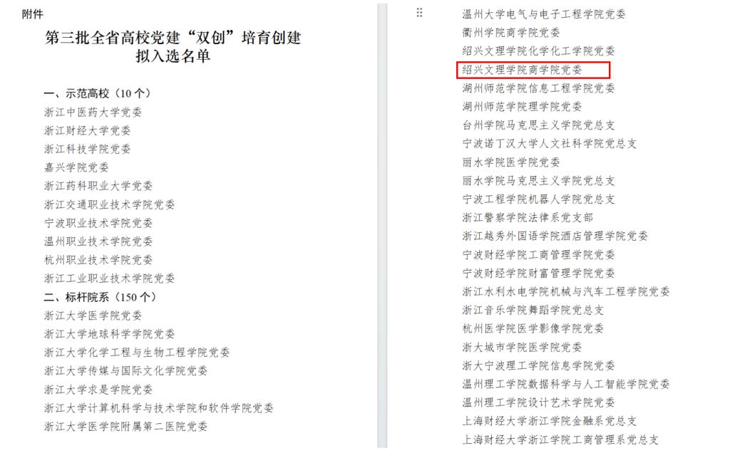 近日,浙江省委教育工作委员会办公室公布了第三批全省高校党建“双创”培育创建对象,确定10所党建工作示范高校、150个标杆院系、151个样板支部、50名研究生党员标兵为第三批全省高校“双创”培育创建对象。买球官网党委成功入选第三批全省高校党建工作标杆系!