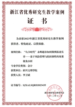 近日,根据浙江省研究生教育学会发布的《关于表彰2023年浙江省优秀研究生教学案例认定项目名单的决定》(浙研教字第〔2023〕18号),买球官网会计专业学位授权点刘晓静老师和李卫斌老师主持的2项优秀教学案例成功入选。