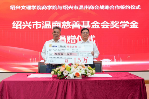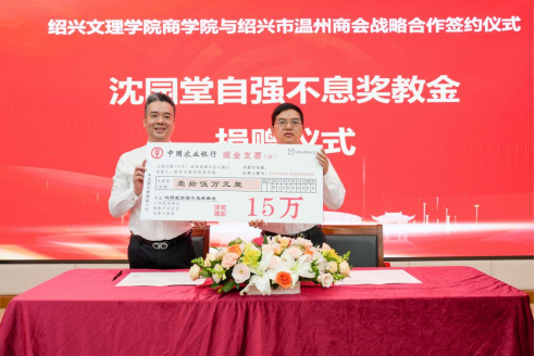 会上,绍兴市温州商会和沈园堂分别向买球App软件手机在线下载捐赠15万元用于成立“绍兴市温商慈善基金会奖学金”和“沈园堂自强不息奖教金”,绍兴文理学院地方服务与合作处处长陈剑波代表学校接受了捐赠并向两家单位颁发了捐赠证书。