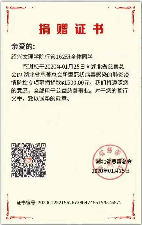 1月25日,农历正月初一,针对湖北省前线医院医疗资源紧张的情况,买球App软件手机在线下载行政管理162班团支部、班委会立即在班级QQ群中,号召全班同学,积极行动,自愿缴纳“特殊班费”,收齐后统一以“绍兴文理学院行管162班全体同学”的名义,在线参与“湖北省慈善总会新型冠状病毒感染的肺炎疫情防控专项募捐”。