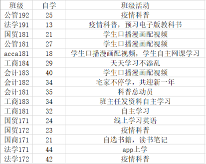 相信很多同学都盼望着假期再长一些,这次突然的延期开学,却让很多同学高兴不起来,宅家防疫的焦虑情绪难以排解,对学期课程的各种担心……面对这样的情况,学院各班级自发组织“宅家云自学活动”,为班级定制一份特殊的寒假作业,全院近五十余个班级参与,参与人数两千逾。
