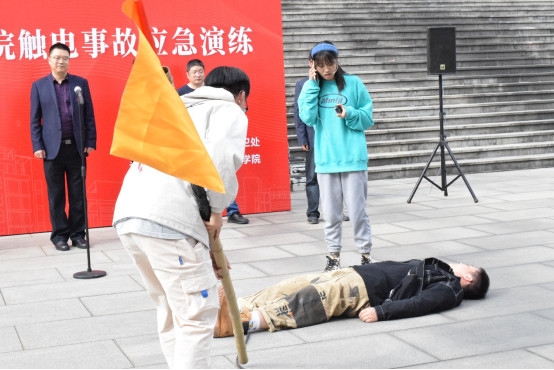 演练现场,河西校区体育馆广场突发学生正步行去河西体育馆上篮球课,因河西校区正在施工,地面上的电线因车辆来回跑动碾压,导致有电线裸露在外,学生甲在学生乙、丙前方因踩到破皮电线触电抽搐倒地,不省人事。同行人员见状,学生乙立即到现场拿绝缘棒把电线挑开,试图拨开电源;学生丙立即拨打了120呼叫救护车,随后拨打校园110报告(88342110/552110),并及时上报辅导员、学院党委副书记,各部门迅速行动,在5分钟内,校园保卫队、医疗救护组、基建及电工赶到现场,投入险情处理和医疗救援中……整个演习过程气氛紧张却井然有序。