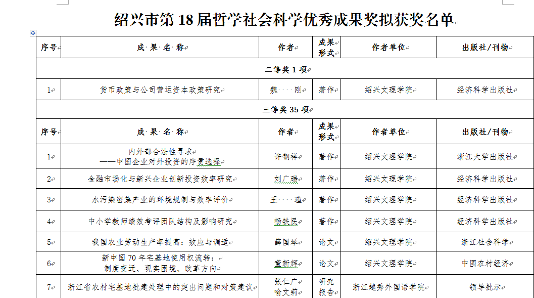 近日,绍兴市哲学社会科学规划评奖领导小组办公室公示绍兴市第18届哲学社会科学优秀成果奖拟获奖名单,全市获奖成果共50项,我校18项成果获奖,获奖率占全市36%。其中买球官网获奖8项,二等奖1项,三等奖7项。
