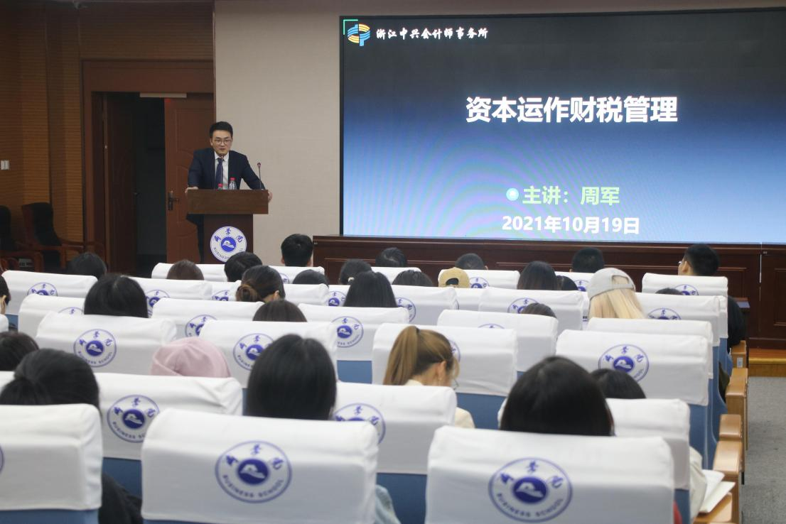 2021年10月19日晚上7时,由MPAcc教育中心、会计系以及风则江会计协会联合承办的稽山会计论坛第12期讲座,在南山校区综合楼A405顺利举行。本次讲座邀请了浙江中兴会计师事务所副总经理周军先生作题为“资本运作财税管理”的主题讲座。会计系部分教师、会计专业研究生、部分本科生参加了会议,MPAcc教育中心主任尹启华博士担任本场讲座的主持人与点评人。