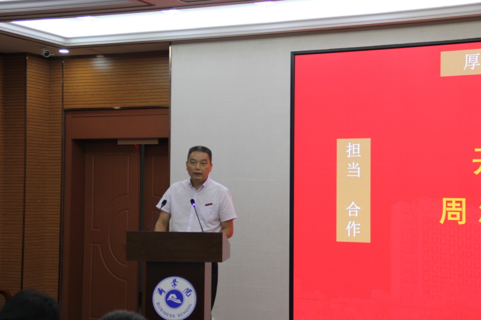 在这个生活节奏飞快,竞争激烈的时代,院长周鸿勇希望同学们能坚守初心和梦想,做好职业规划,确定人生目标,提高自我能力并牢记习近平总书记的嘱托,“青春向党,不负人民,让青春之花在不懈奋斗中绽放绚丽之花”。他指出,面对梦想同学们要有勇气和行动,用理想之光照亮奋斗之路,用行动之力逐梦前行,并提出三句话与同学们共勉。一是君子爱财,取之有道。同学们要传承范蠡“旱则资舟、水则资车”的经营智慧,充分发挥自己的聪明才智,以正当途径和辛勤汗水获取财富。二是仁爱之心,家国情怀。同学们应有“先天下之忧而忧,后天下之乐而乐”的大任担当,以仁义为立身之本,自信昂扬,努力拼搏,勇毅前进。三是注重实践,知行合一。新时代是追梦者的时代,只有动起来才能画出属于自己的锦绣山河,同学们要热情拥抱生活,不放纵不放弃,成为一个有梦想敢拼搏的未来人生赢家。