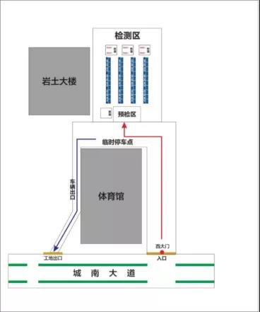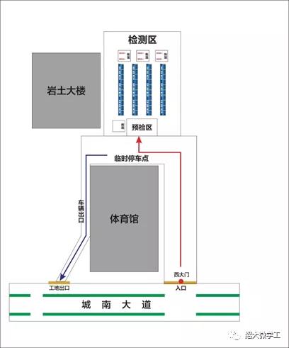 统一从西大门进校,沿体育馆绕行(红色箭头方向行进),在岩土大楼停车场进行验证、测温,经确认后前往宿舍区。接送车辆、陪同人员在同学下车后立即驶离校园,从出口出校园(蓝色箭头方向行进)。