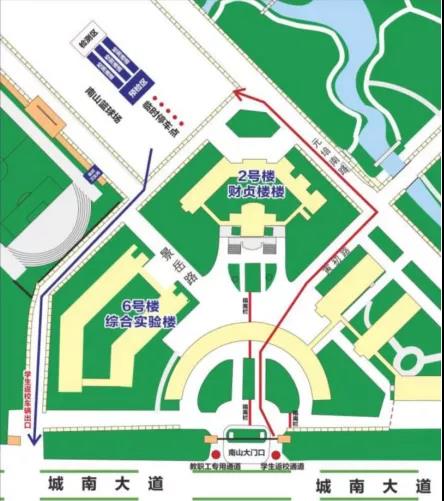 南山校区:统一从正大门东侧进校至篮球场(红色箭头方向行进),接送车辆、陪同人员在同学下车后立即驶离校园(蓝色箭头方向行进)。