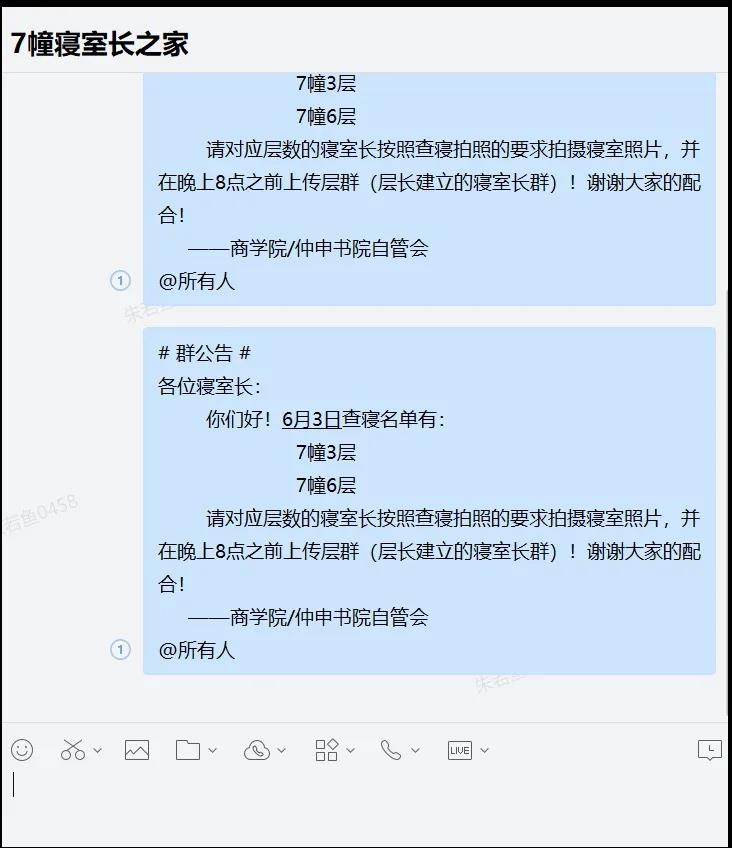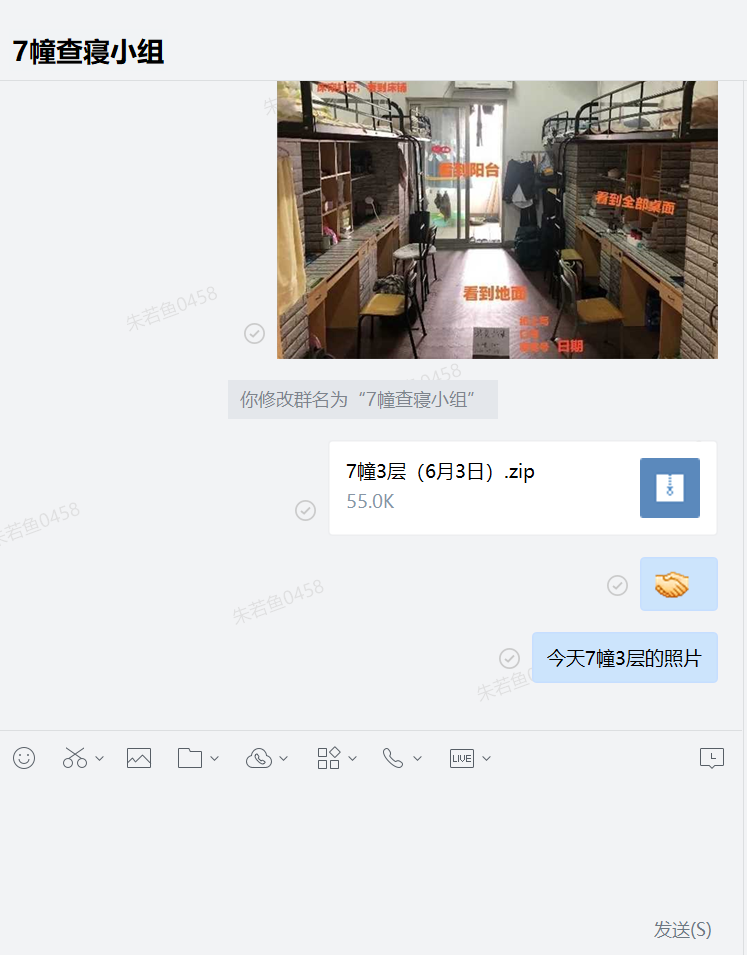 4、 层长于当晚21:00之前将所有的寝室照片收集完毕打包发送至自管会查寝小组群,并由查寝表安排人员在系统上评分。