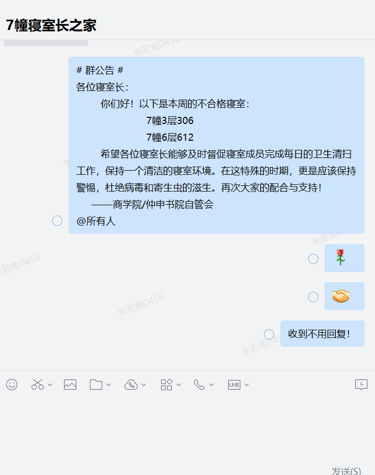 5、查寝人员于当晚22:00之前评分完毕,将不合格寝室的截图信息报送组长。