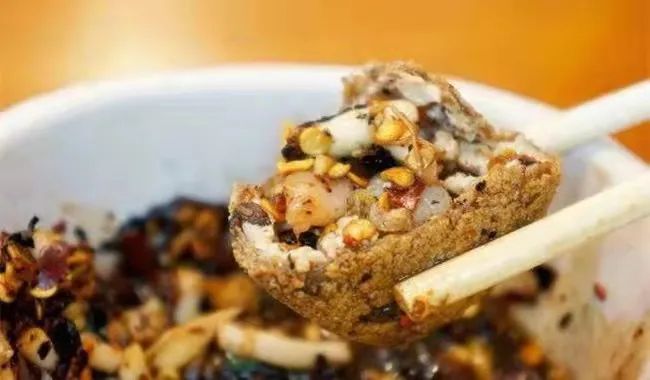 恋爱豆腐果是贵阳有名的风味小吃,食用时用薄竹片将豆腐当腰剖开,添进由胡辣椒、生姜米、葱、蒜泥、酱油、醋等调制而成的佐料,趁热吃下,咸辣爽滑、满口喷香。